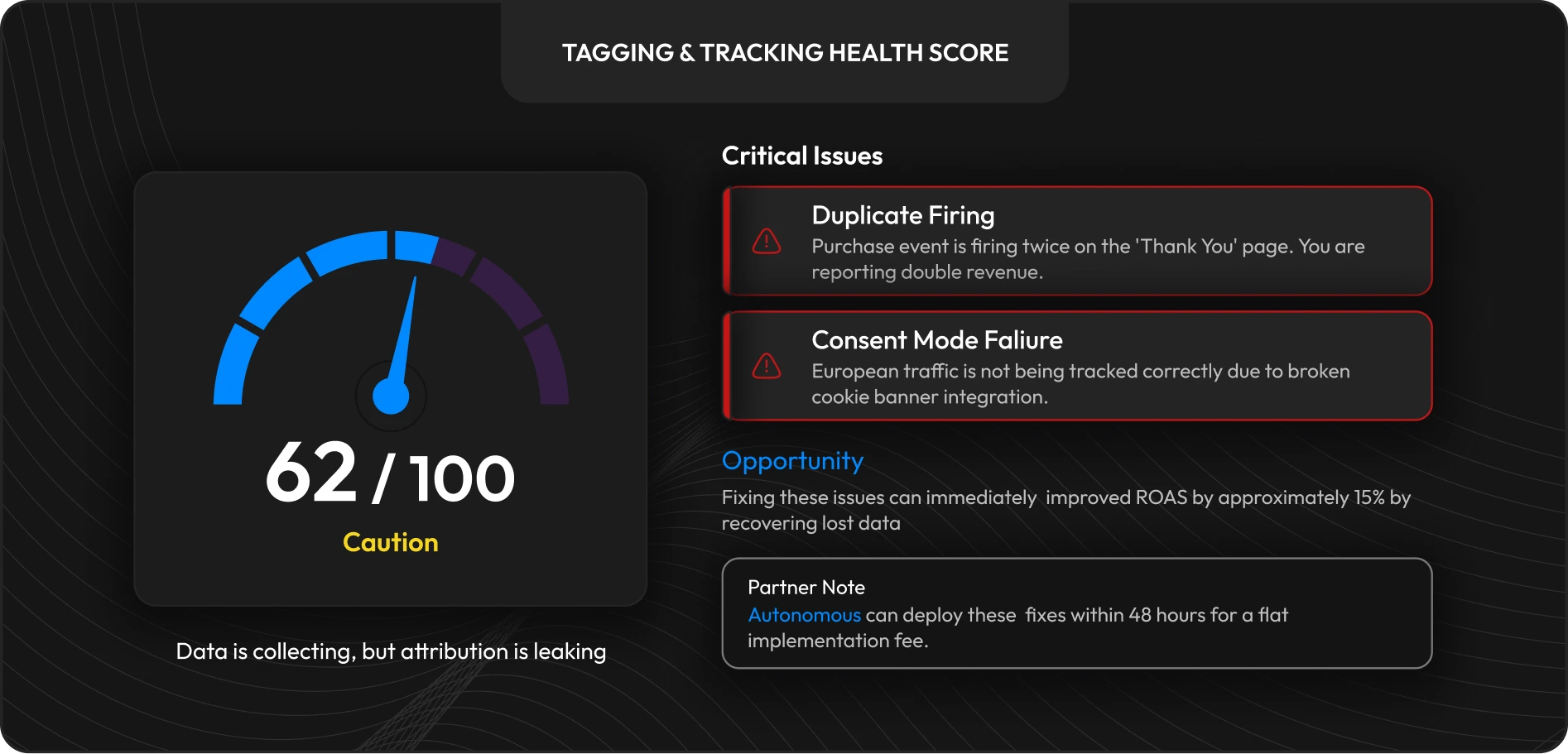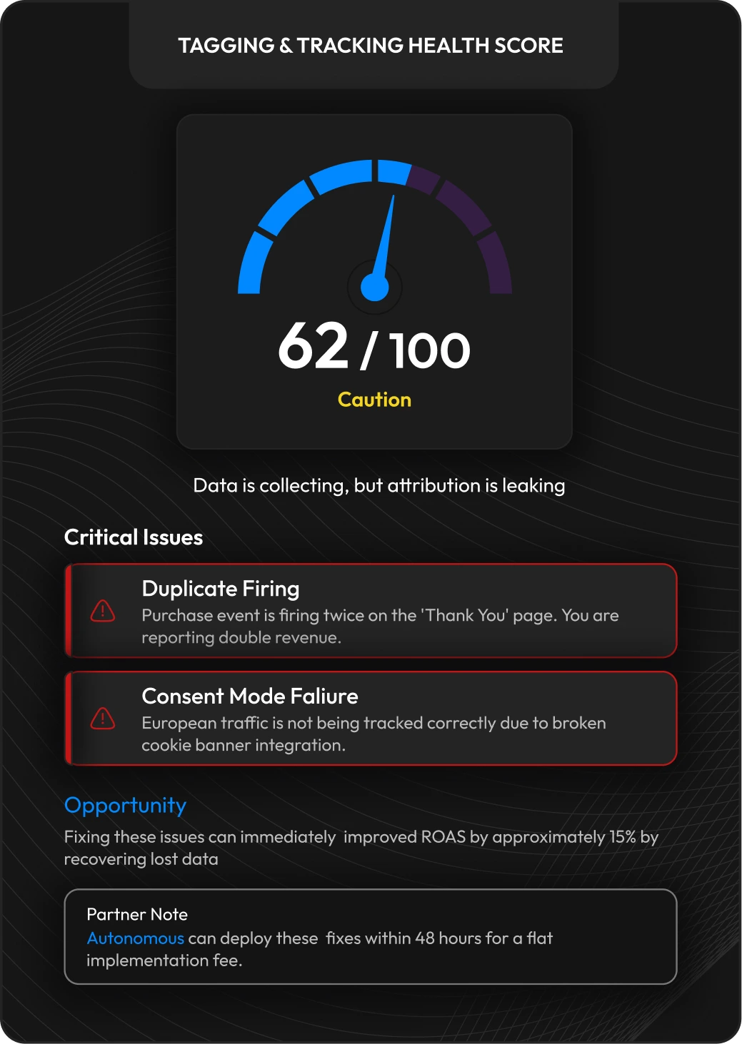 We don’t just look at settings; we simulate traffic to hunt for ‘ghost tags’ inflating your metrics, delivering a clear Red/Yellow/Green report in 3 days so you know exactly what is broken and how to repair it.
